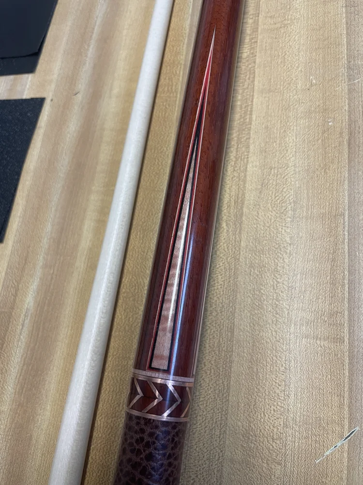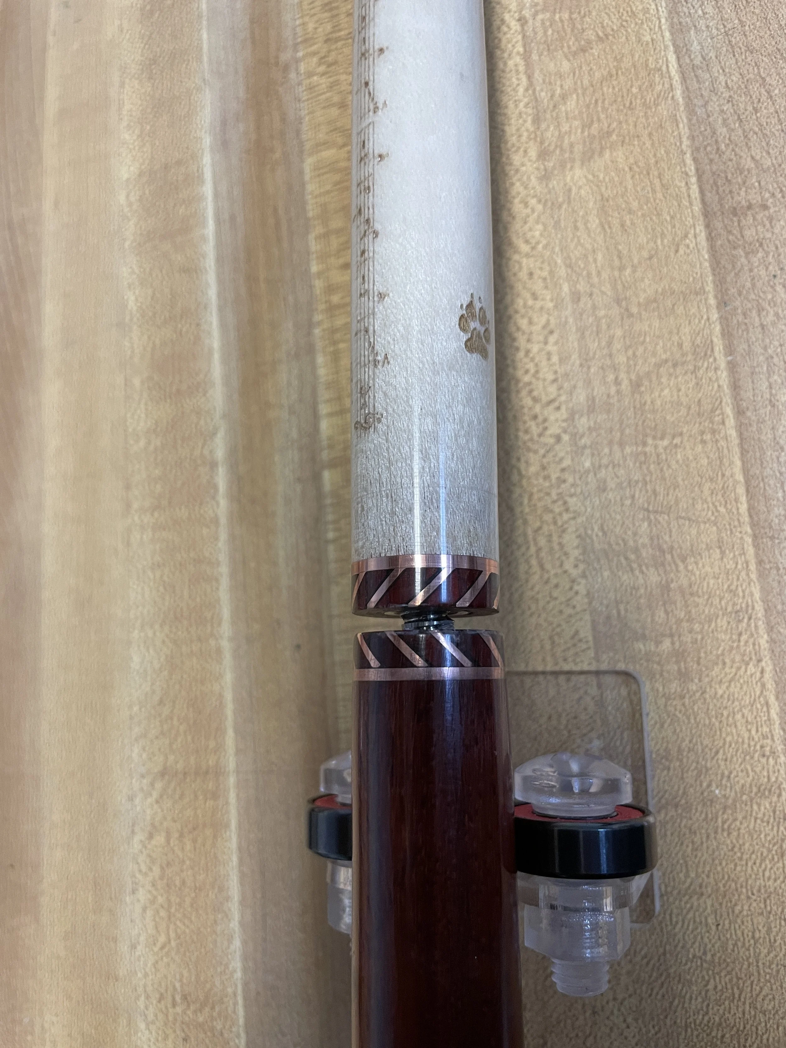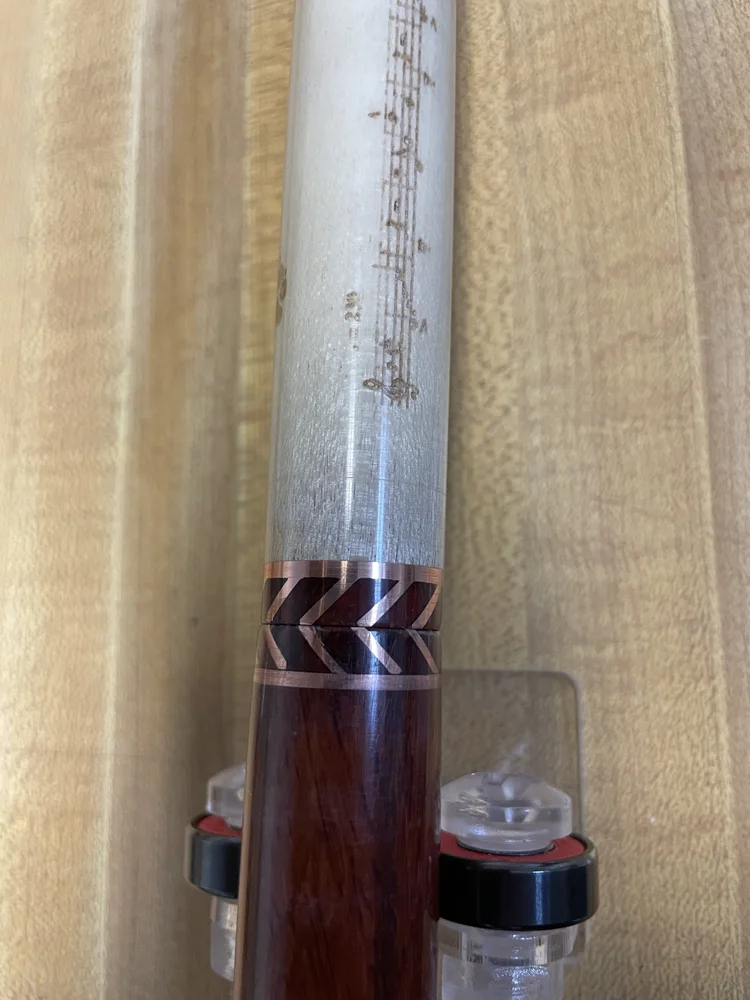 This cue is one that I started simply to fill time and get some practice with technique both in craftsmanship and finish. It features a forearm of Padauk with tiger maple points and matching windows. The ring work on this cue is copper in a unique chevron pattern that I envisioned as a challenge to myself. The joint collar and shaft collar make up the halves of the final chevron to finish off the cue. The points and boxes on the butt sleeve are more challenges to myself in that the veneers make up window frames for both. Amber saw the cue and decided it spoke to her. After some discussion on customization she decided musical notes and puppy prints were going to be her signature on this cue. She sent me some artwork for both including a piece of sheet music that holds some meaning for her.