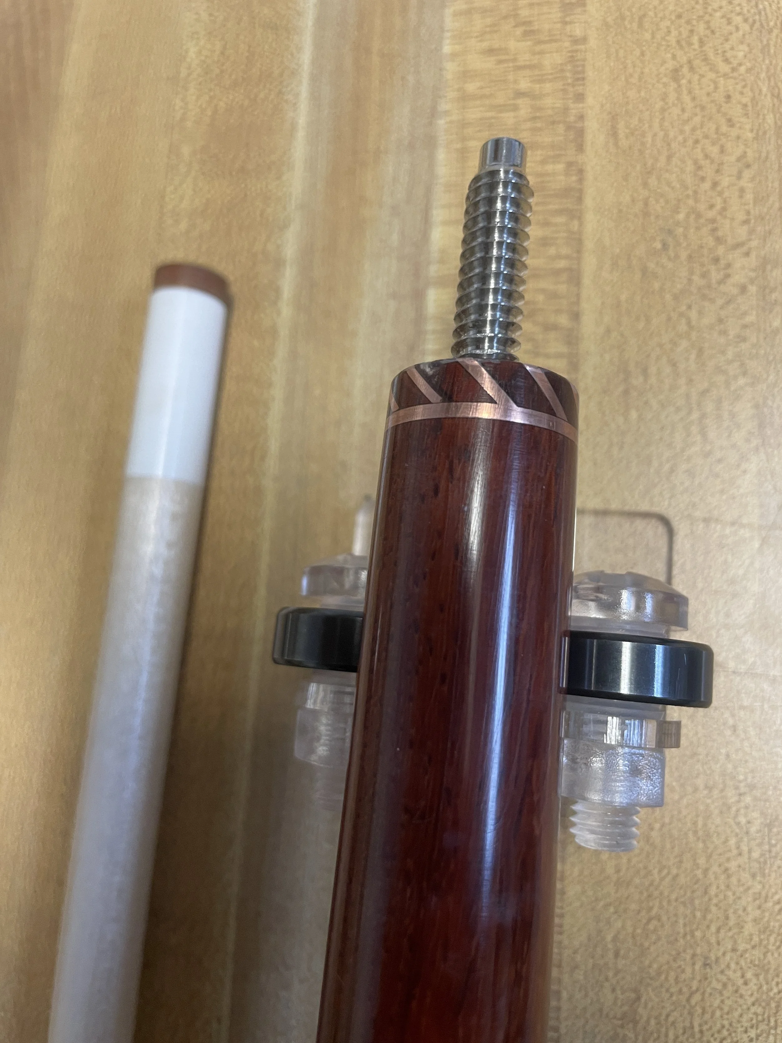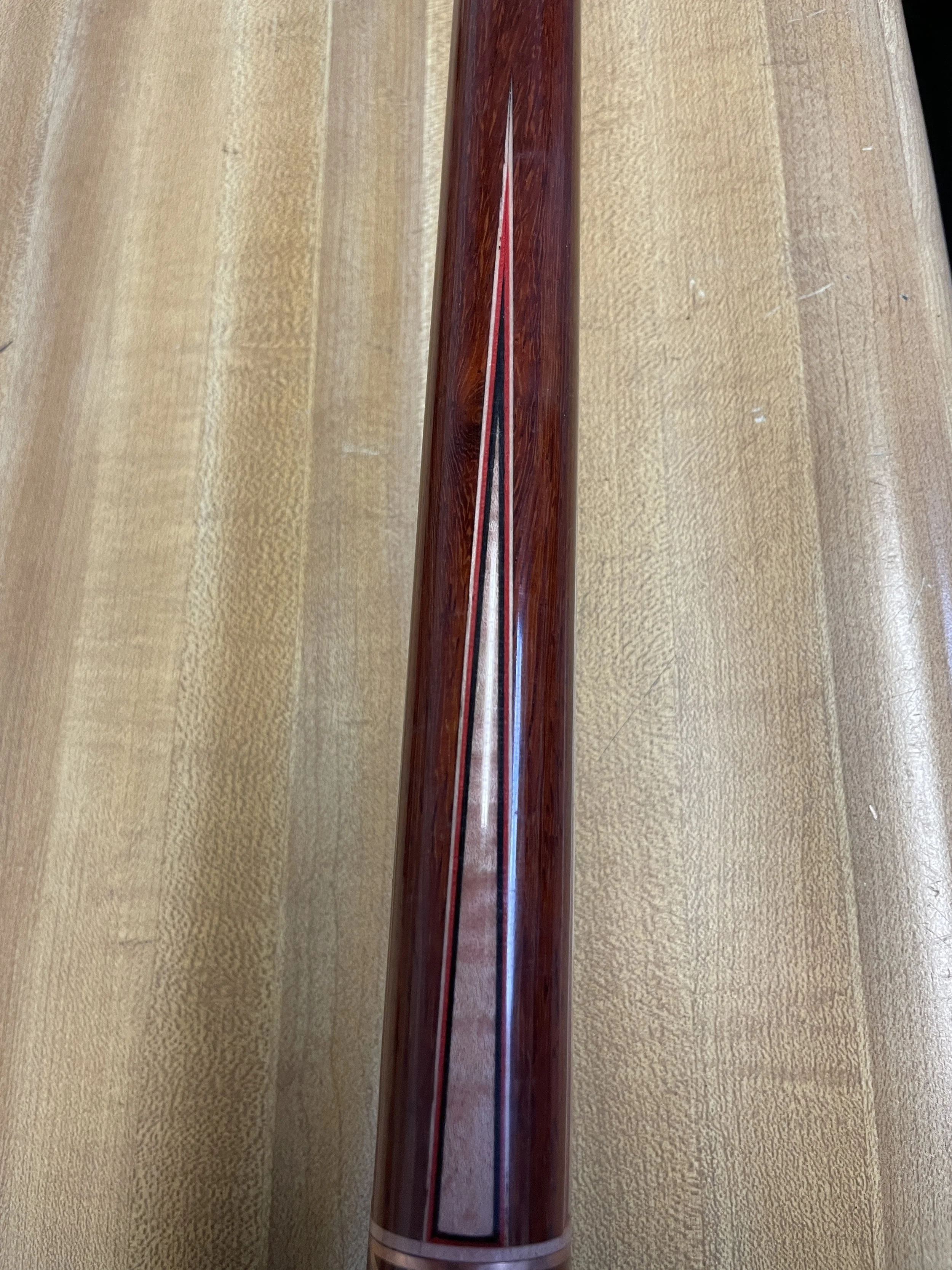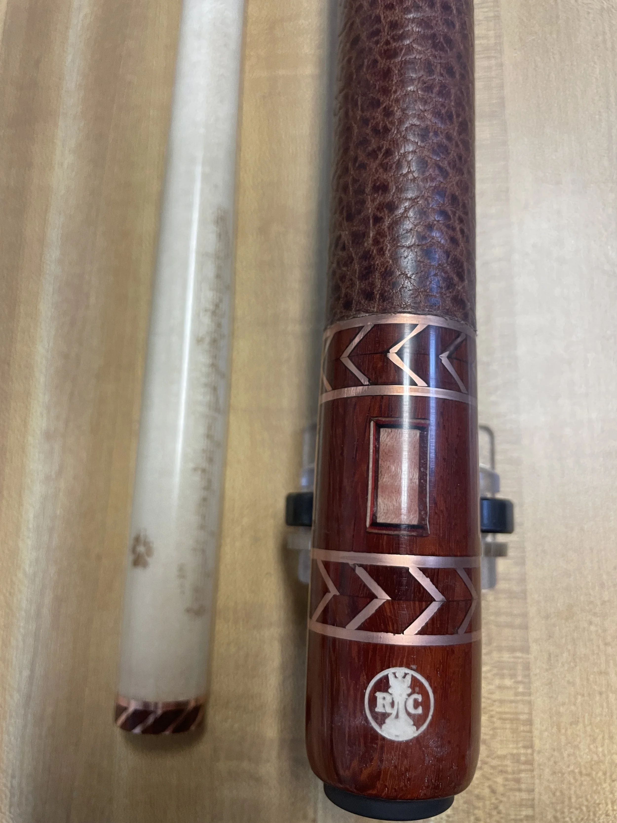 This cue is one that I started simply to fill time and get some practice with technique both in craftsmanship and finish. It features a forearm of Padauk with tiger maple points and matching windows. The ring work on this cue is copper in a unique chevron pattern that I envisioned as a challenge to myself. The joint collar and shaft collar make up the halves of the final chevron to finish off the cue. The points and boxes on the butt sleeve are more challenges to myself in that the veneers make up window frames for both. Amber saw the cue and decided it spoke to her. After some discussion on customization she decided musical notes and puppy prints were going to be her signature on this cue. She sent me some artwork for both including a piece of sheet music that holds some meaning for her.