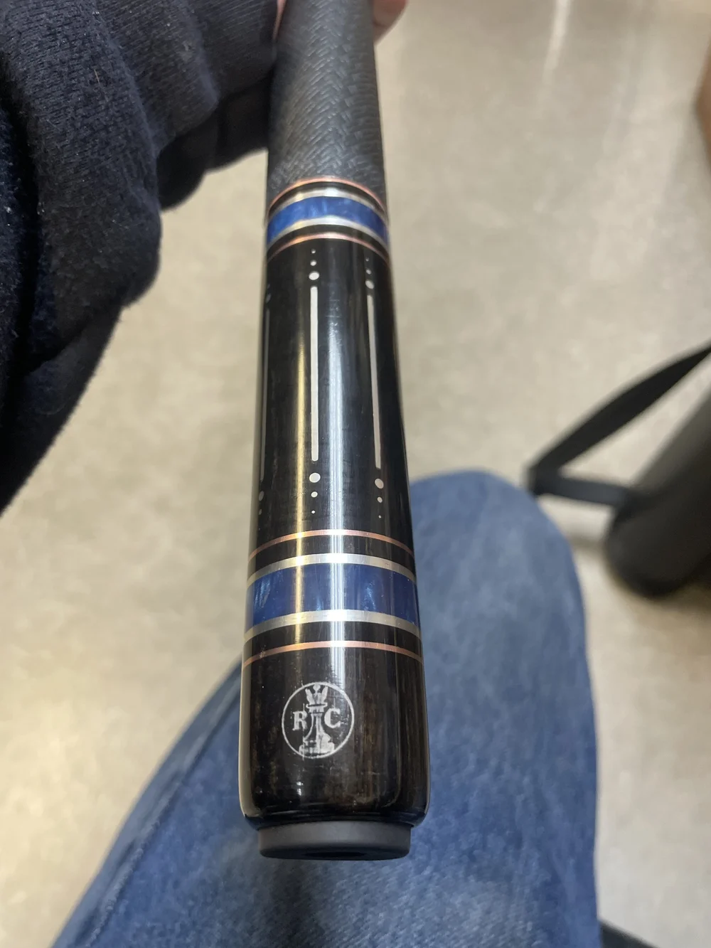 This cue boasts an ebony forearm, epoxy points and accompanying ring work, sterling silver and copper veneers as well as the ring accents, and finally sterling silver dots and stripes to dress it up a little. All in all, it’s a heavy cue at 21 oz. with no weight bolts. It hits rather hard with the stainless steel collar and joint but that’s what she wanted, a hard-hitting, heavy cue. The balance is great and it plays very well.